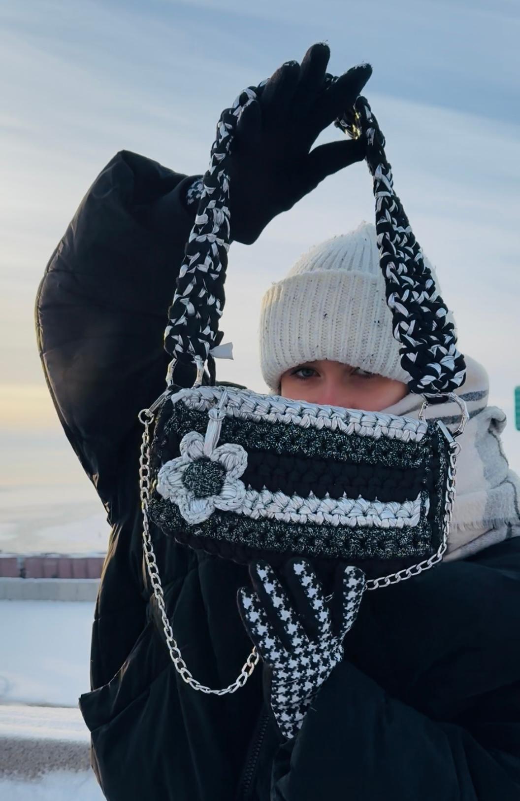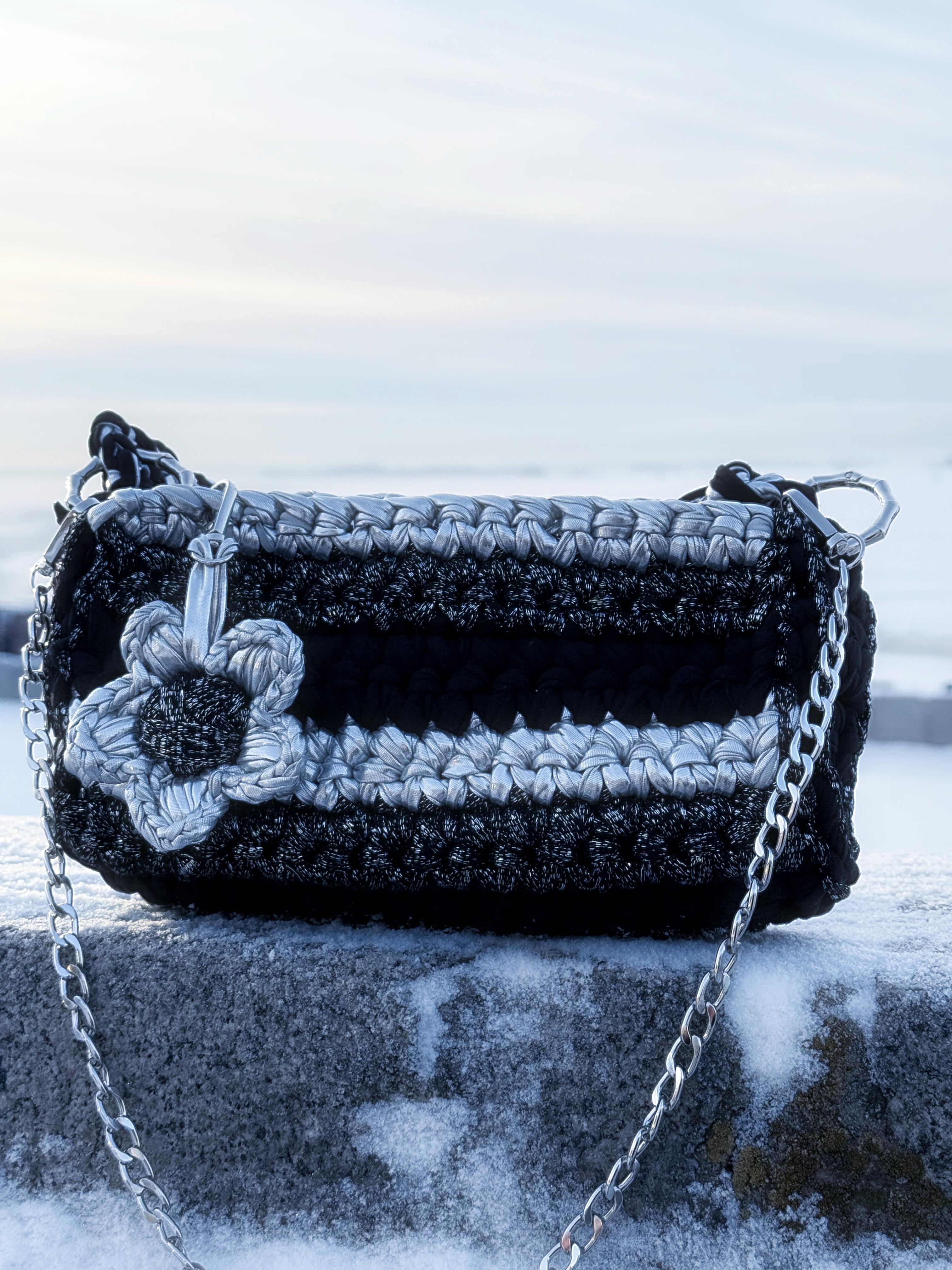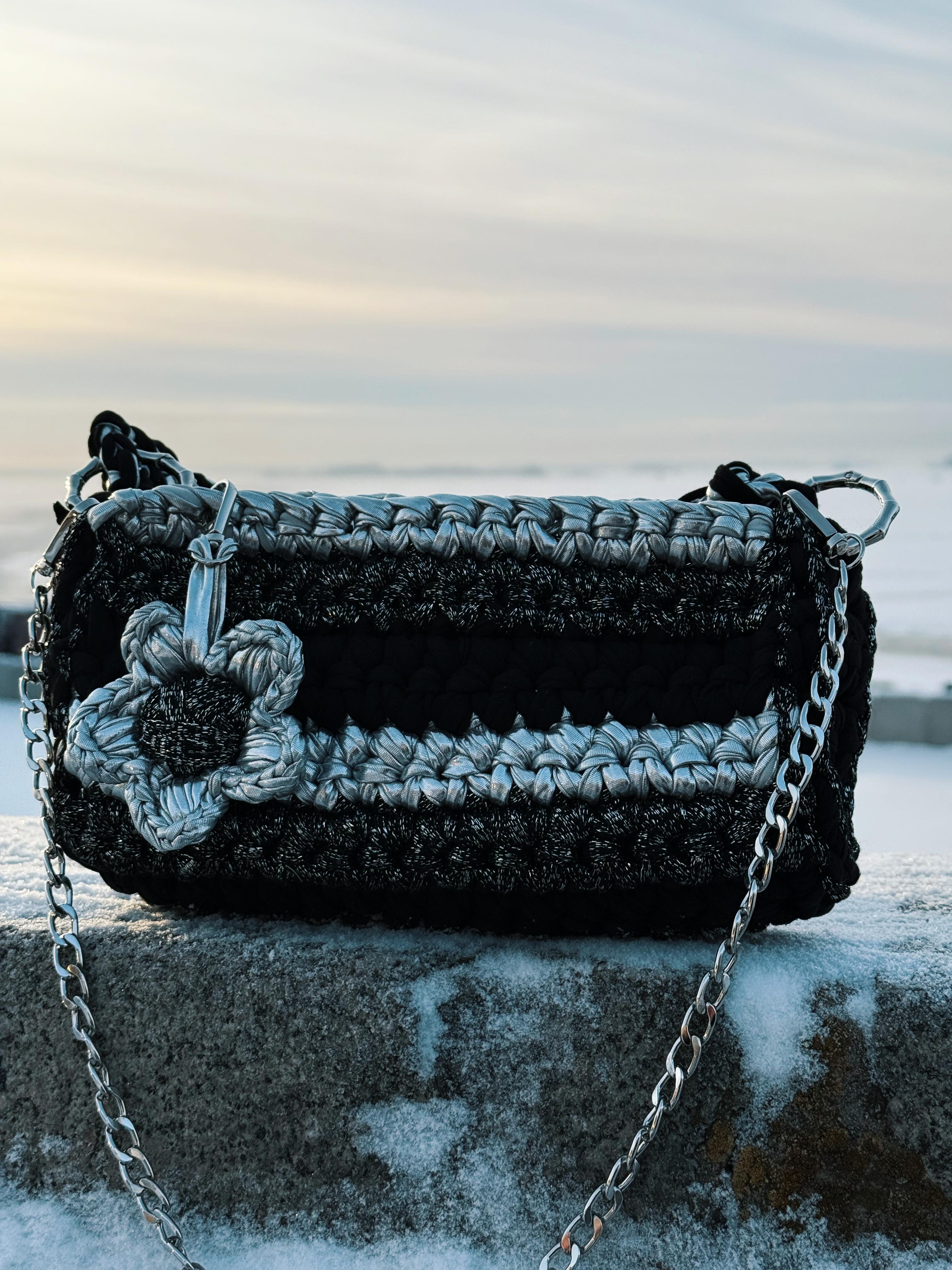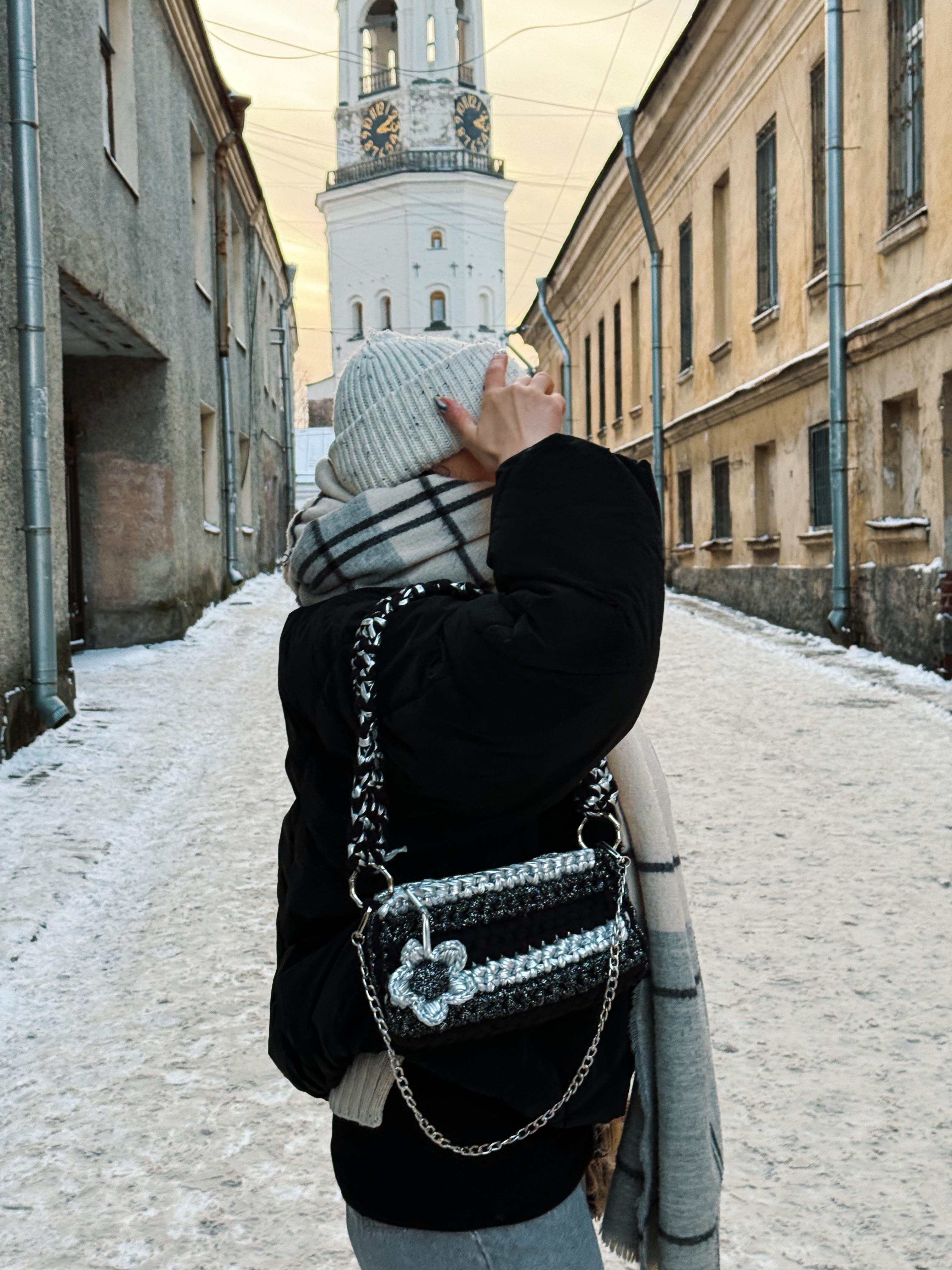 Сумка Elsa — холодное изящество, внутренняя магия и сияние, которое никто не сможет скрыть. Изделие выполнено в глубоком серебряно-черном оттенке с вплетенной металлизированной пряжей, благодаря которой сумка мерцает при каждом движении. Сумка дополнена акцентными деталями - серебряной цепочкой, холодным и дерзким акцентом, как узор на ледяном узоре. А также брелоком в виде цветка, который напоминает волшебный цветок, проросший сквозь вечную мерзлоту. Изделие застегивается на магнит и имеет размер 24 x 13 см, туда поместится всё самое необходимое. Elsa для тех, кто знает, что истинная красота — это прохладный загадочный блеск, внутренний свет и безупречный вкус. Let it glow with Elsa🤍