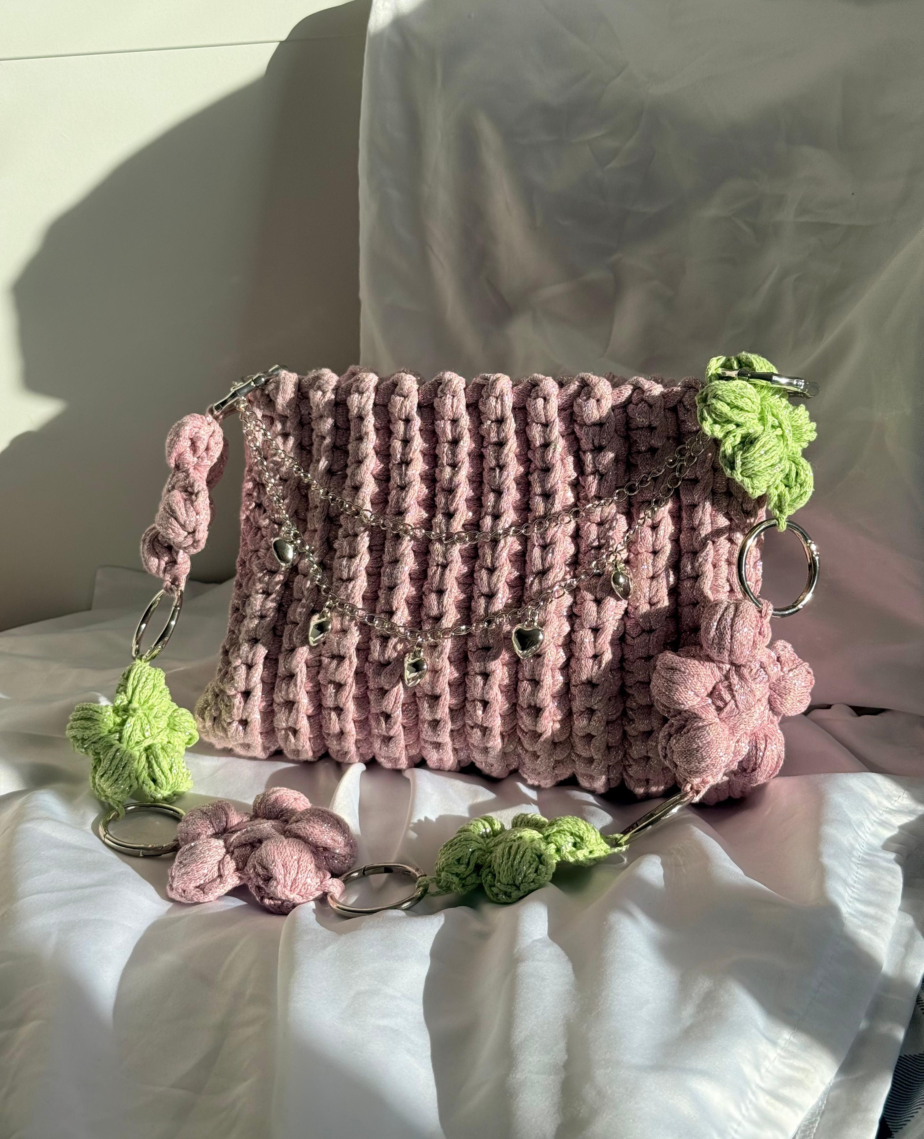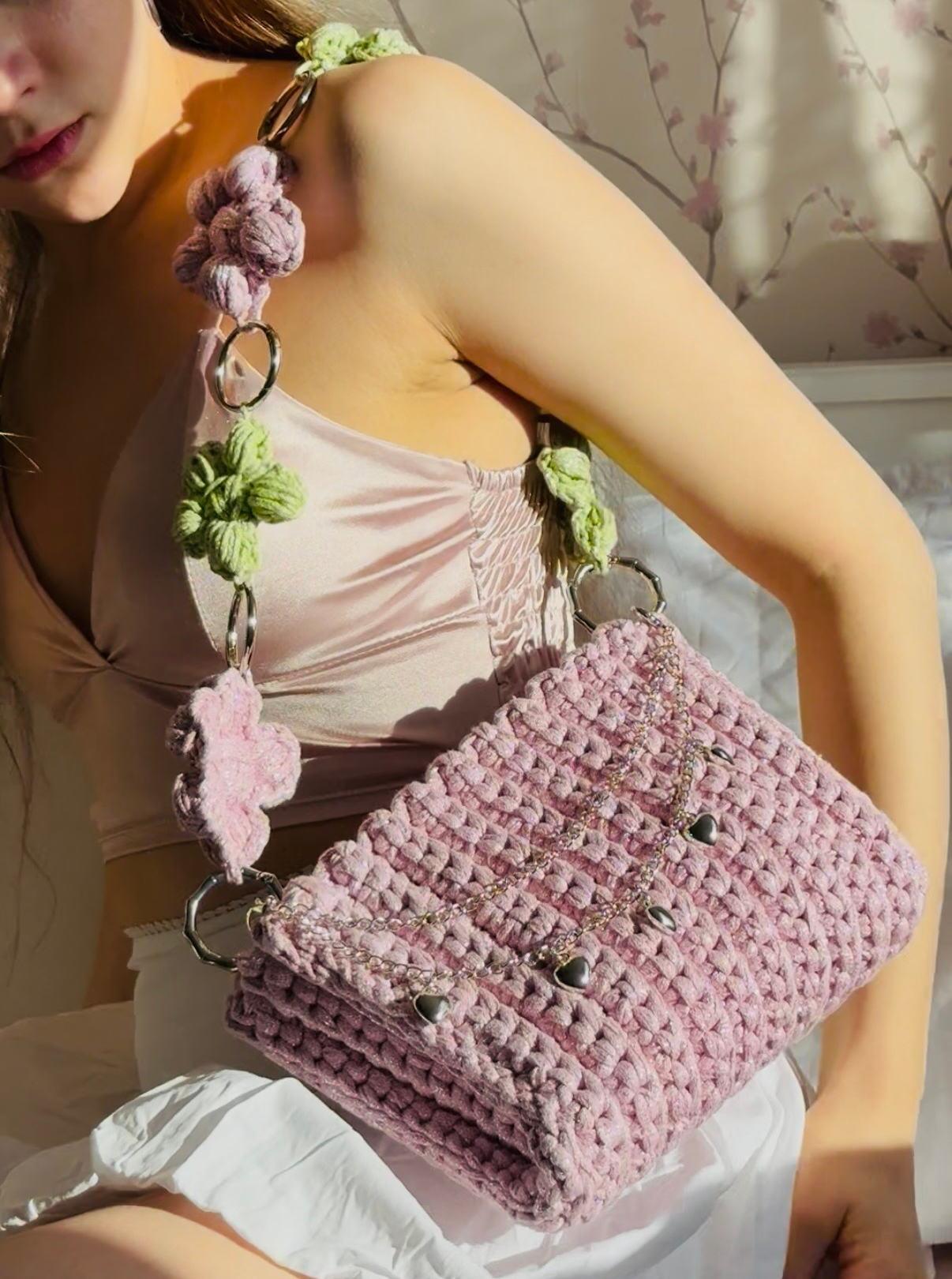 Сумка Flora - нежно-розовое сверкающее изделие, которая олицетворяет наступление весны, её цветения. Изделие выполнено из хлопковой пряжи с добавлением люрекса, за счет которого она блестит при солнечных лучах. Плечевой ремень создан из первых весенних цветов в сочетании розовых и светло-зеленых оттенков, которые сплетены серебряной фурнитурой. Сумка дополнена нежной подвеской с сердцами, ведь скоро любовь, скоро весна...🌸 Размер сумки 24 Х 17 см, в нее поместятся все необходимые вещи и даже больше. Расцветай и дополни свой образ сумкой Flora💫 P.S. сумка может стать также отличным подарком подруге, любимой девушке или маме, мы отправляем наши изделия в коробках с логотипом бренда, тебе не нужно думать об упаковке, мы все сделаем за тебя с вниманием к каждой детали💓