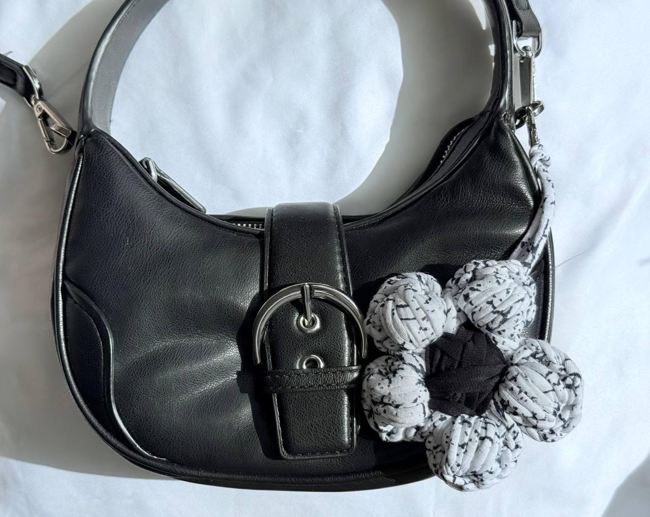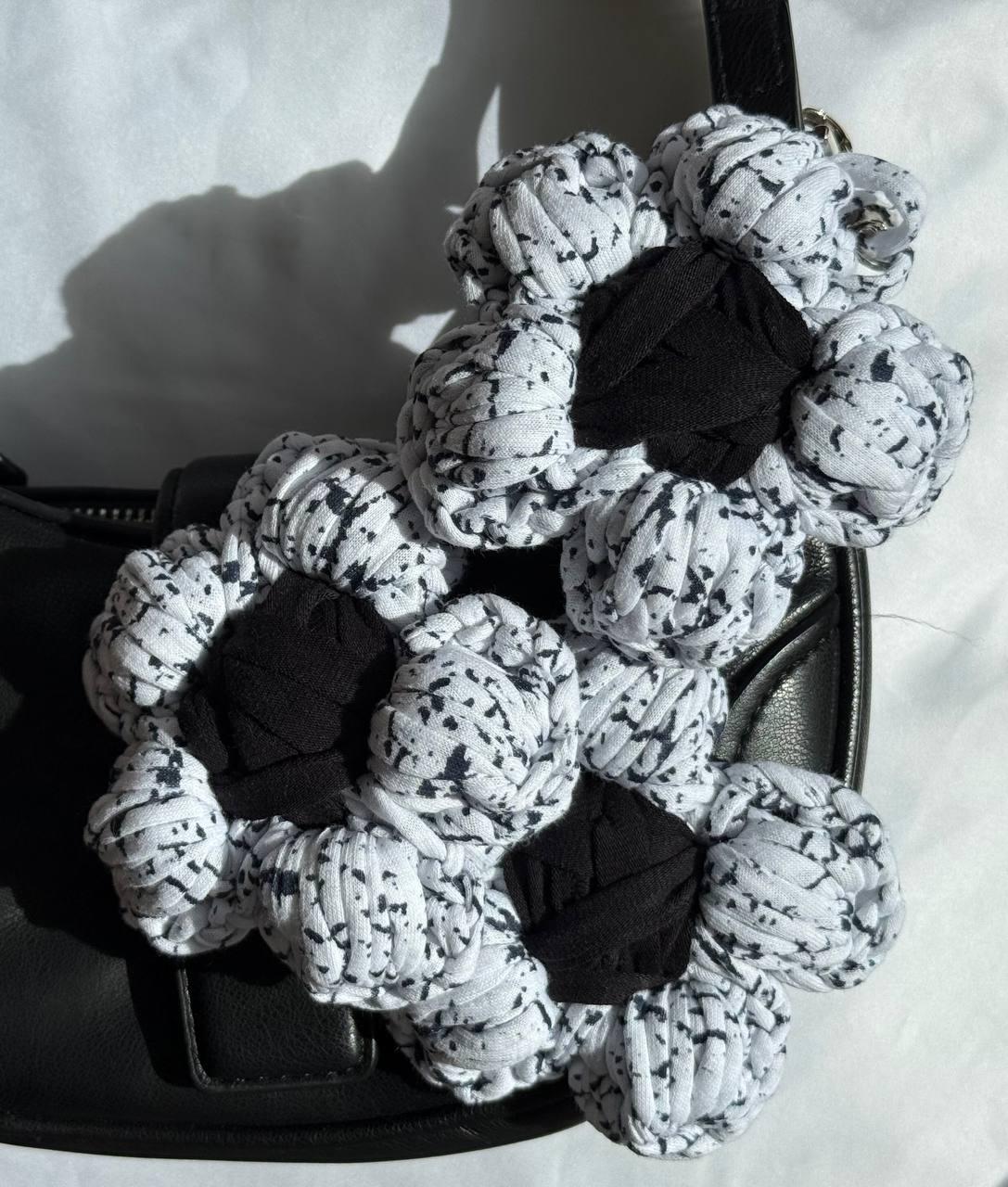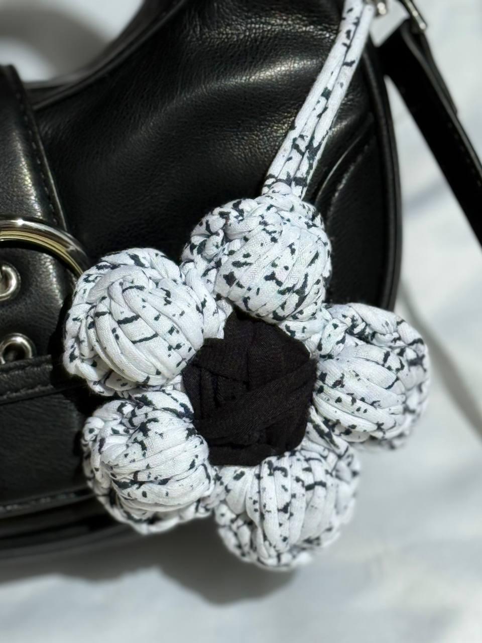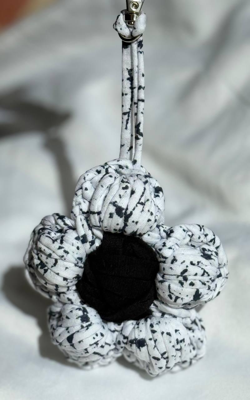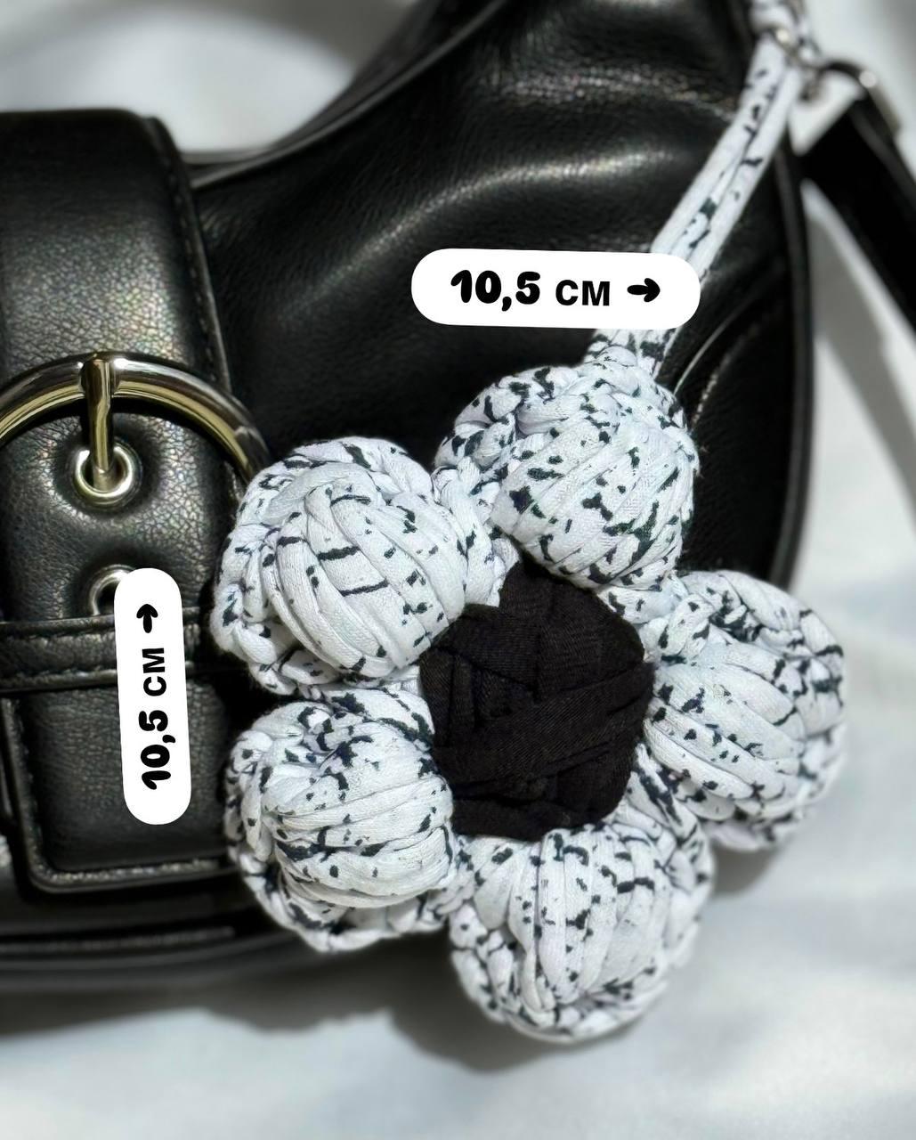 Брелок "Flower Moscu" - стильный и оригинальный обвес ручной работы, который станет отличным дополнением к вашей сумке или любому другому элементу гардероба. Брелок выполнен в виде цветка из хлопковой трикотажной пряжи, его легко можно стилизовать засчет сочетания классических цветов - черного и белого. Однако белые лепестки имеют черные оригинальные вкрапления, которые точно добавят уникальности в твой образ. Брелок "Flower" - это не просто аксессуар, это отражение вашего стиля и индивидуальности.