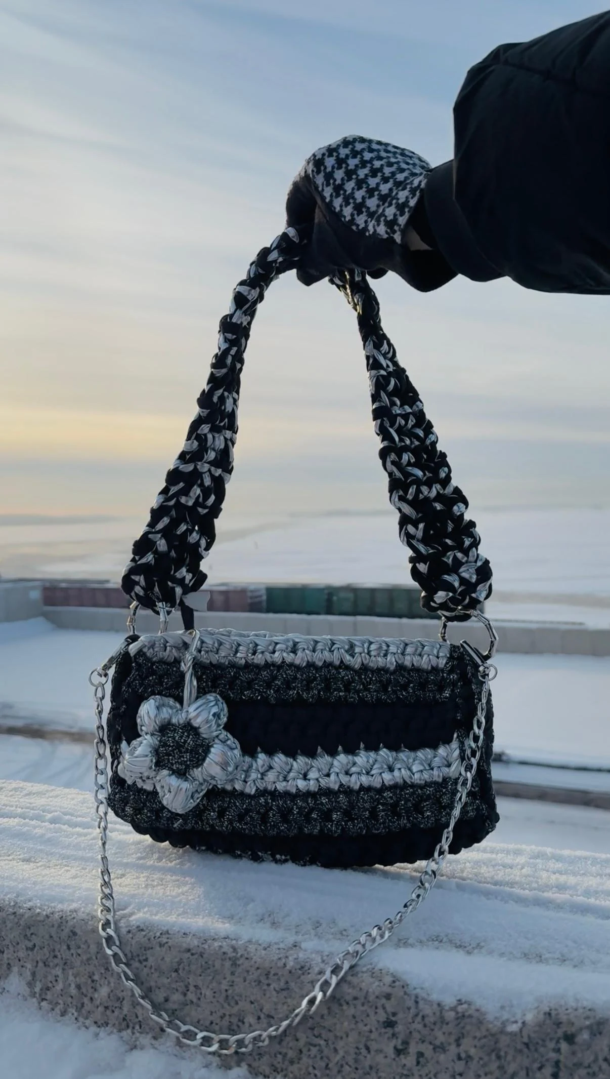 Сумка Elsa — холодное изящество, внутренняя магия и сияние, которое никто не сможет скрыть. Изделие выполнено в глубоком серебряно-черном оттенке с вплетенной металлизированной пряжей, благодаря которой сумка мерцает при каждом движении. Сумка дополнена акцентными деталями - серебряной цепочкой, холодным и дерзким акцентом, как узор на ледяном узоре. А также брелоком в виде цветка, который напоминает волшебный цветок, проросший сквозь вечную мерзлоту. Изделие застегивается на магнит и имеет размер 24 x 13 см, туда поместится всё самое необходимое. Elsa для тех, кто знает, что истинная красота — это прохладный загадочный блеск, внутренний свет и безупречный вкус. Let it glow with Elsa🤍