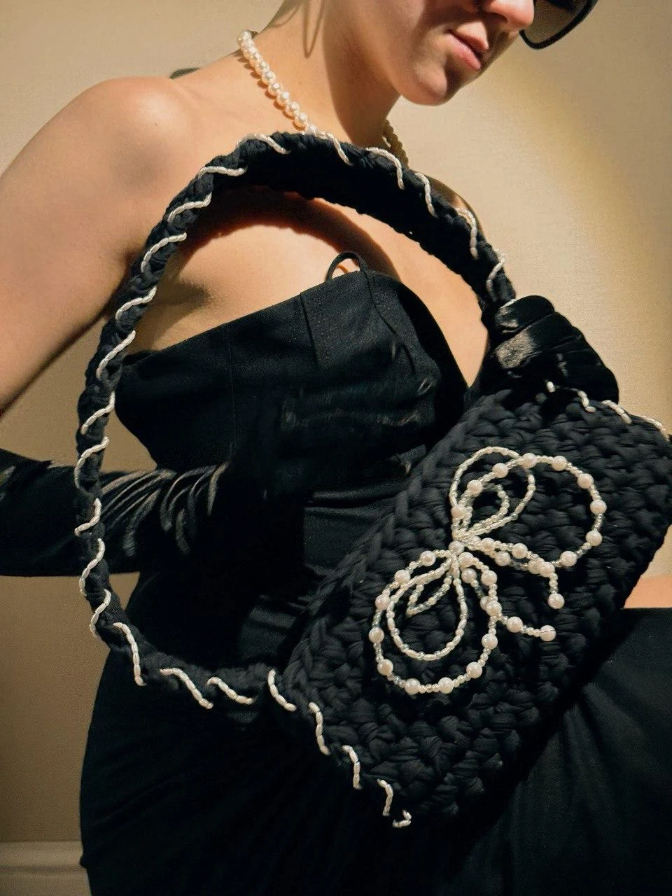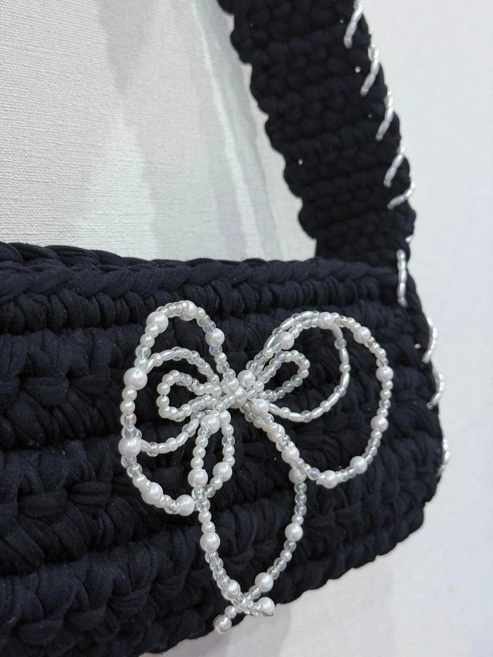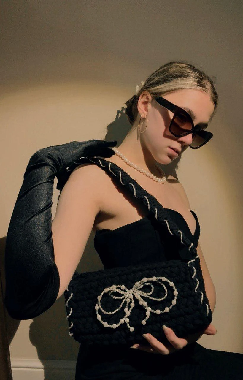 Сумка «Tiffany» олицетворяет элегантность и утонченность и точно не оставит тебя незамеченной на вечернем мероприятии🤍 Сумка имеет классическую форму багет, сделана из хлопковой трикотажной пряжи, которая отлично держит форму. А жемчужный бантик и окаемка из белоснежный бусин добавит изящности и шарма твоему образу💫 Изделие застегивается на магнит, чтобы все твои вещи были в целости и сохранности. Размер сумки: 27 Х 13 см